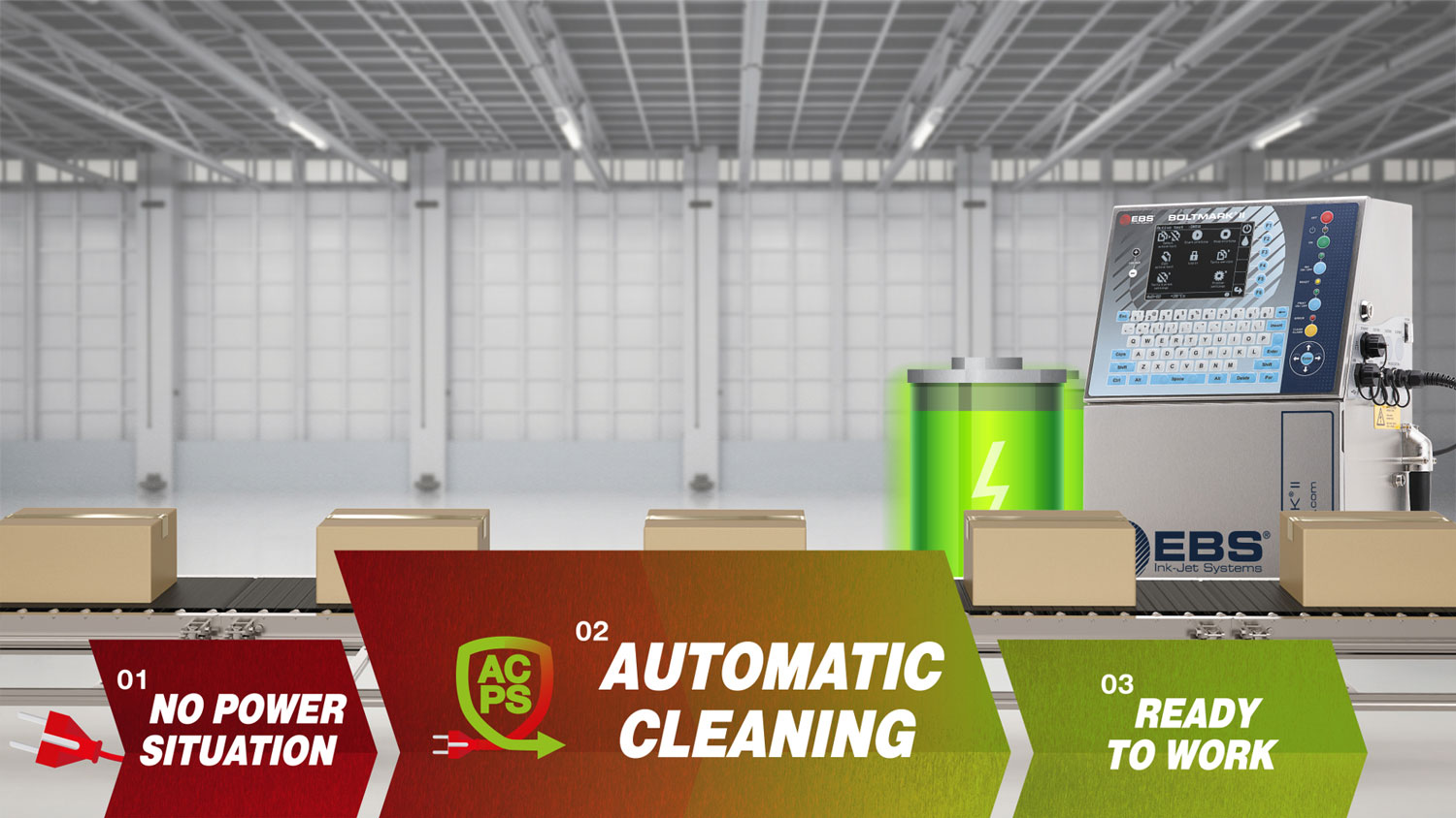 Weltneuheit: Erstmals in einem Continuous Ink Jet Printer sorgt ein intelligentes System für einen zuverlässigen Druckerbetrieb bei Stromausfall. Wird die Stromzufuhr für weniger als 30 Sekunden unterbrochen, arbeitet der Drucker weiter. Wenn die Zufuhr für mehr als 30 Sekunden unterbrochen wird, startet der Drucker den automatischen Abschaltvorgang einschließlich Spülung, um die Leitungen vor getrockneten Farbablagerungen zu schützen. Sobald die Stromversorgung wiederhergestellt ist, ist der Drucker schnell wieder betriebsbereit. Der ACPS enthält sehr langlebige Super Charger Kondensatoren, keine herkömmlichen Akkus. Das Aufladen dauert nur ca. 2 Minuten. Das ACPS ist optional erhältlich (nur für EBS-6600 und EBS-6900).